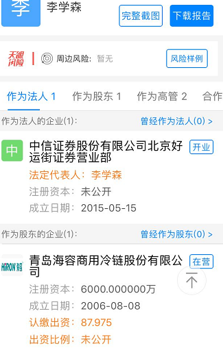 但据记者了解到,《天眼查》在统计同一自然人担任重要职务时,是以身份证号作为统计原点,而并非是仅仅凭借姓名,这样可以有效防止因为重名而导致的统计差错。这一点体现在《天眼查》系统中,查询姓名为“李学森”的相关信息时,会显示出数十个姓名同为“李学森”的组合,而海容冷链发起股东中的“李学森”和中信证券北京好运街证券营业部负责人“李学森”恰恰是在同一列组。