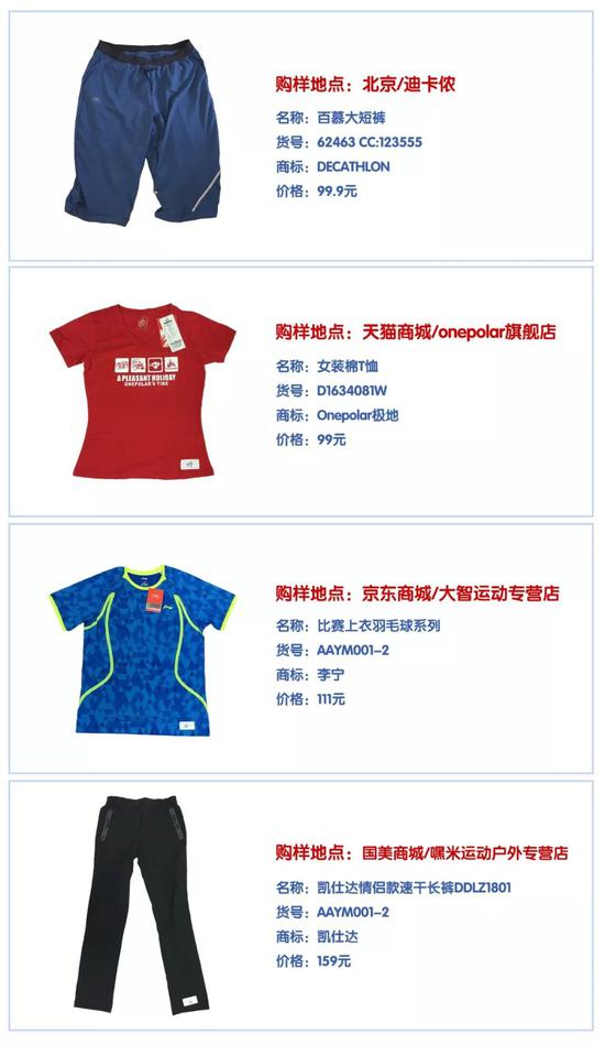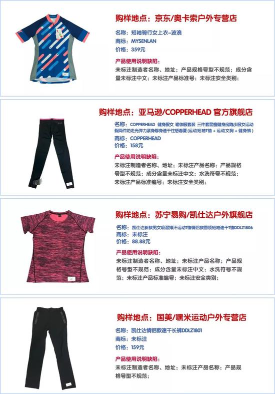 纤维含量是判定速干衣材质的重要依据,虚标和错标都反映了生产企业质量把控不严。对于此类商品,消费者慎重购买。以下4款样品的纤维成分及含量未能达到国家标准要求。