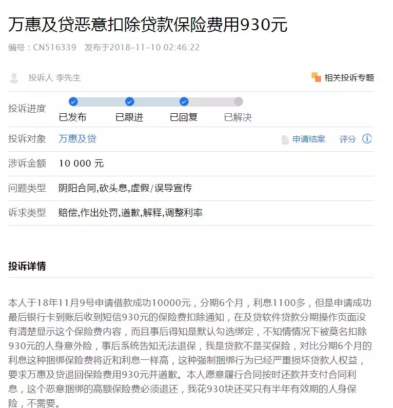 据了解,2018年11月9日,该借款人李先生在及贷上申请了10000元贷款,分期6个月,但申请成功借款到账后,收到银行短息显示,“扣除了930元保险费”。