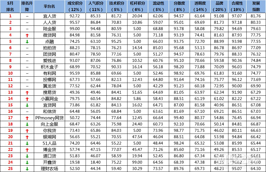 排名下降,5月点融对其信披做出了进一步改善,新上线了平台年度运营报告等信披项目,透明度得分上升。而在分散度得分上,平台借款项目不少涉及中小微企业借款,本期的分散度得分有所下降。5月点融的成交量环比下降了近20%,单月成交量约为7.5亿元,使得成交积分环比出现了下降。