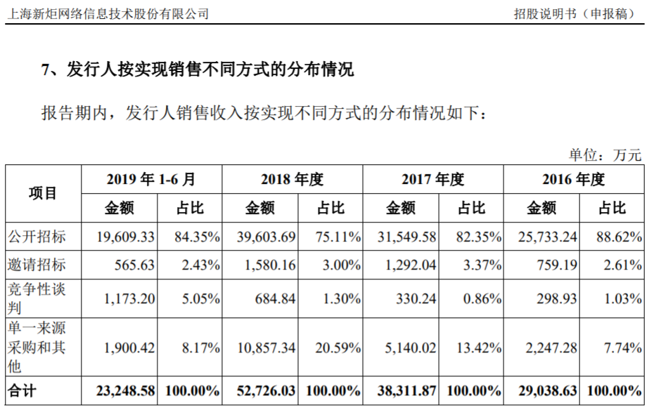对此,招股书也披露:2018年,发行人通过招投标实现的收入占比较低,主要系发行人于2016年、2017年陆续取得大型企业的原厂软硬件供应商资格,客户基于发行人具备供应商资格和过往良好合作关系,采用单一来源采购方式向发行人采购的金额显著提高。